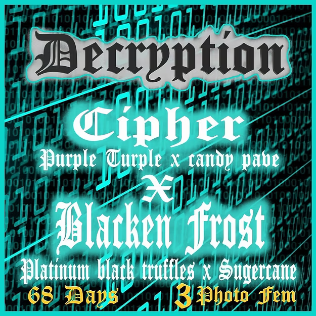 Decryption will steal the show every time! She's blingy, minty, and gassy. She shows her roots from the candy pave, heavy yields of gassy big buds with hints of pink and dark green, just stunning! She loves to be topped. She'll be the gem of any grow!